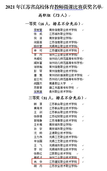 近日,江苏省教育厅公示了2021年江苏省高校体育教师微课教学比赛获奖名单,yl6809永利申可、肖华两位老师分别获得高职组一等奖和三等奖。